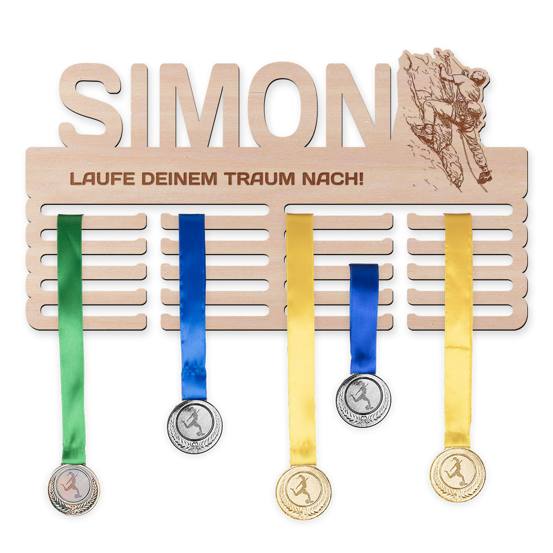 Wir fertigen Medaillenhalter maßgeschneidert nach Ihren Wünschen. Geben Sie einfach den Namen, einen motivierenden Spruch und eine sportliche Silhouette an, und wir kümmern uns um den Rest.
